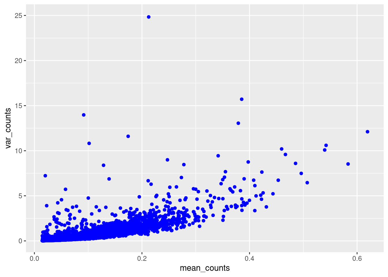 We see that variance generally increases with mean counts (gene expression), so cells with low counts are candidates for removal.